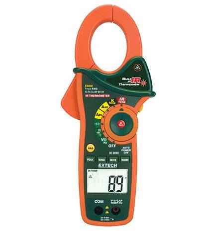Extech EX820: 1000A True RMS AC Clamp Meter with IR Thermometer: TRMS AC Clamp-on multimeter with built-in non-contact InfraRed Thermometer and K Temperature probe. Other functions include AC/DC voltage, resistance, Type K thermometer, capacitance and frequency.