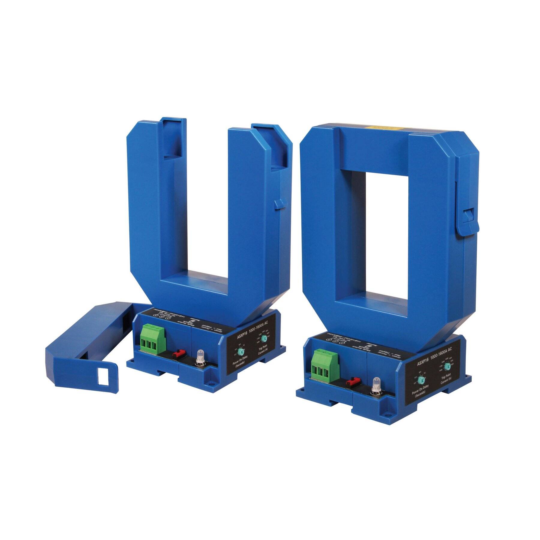 The ASXP Series products are powered, current-operated switches that trigger when sensed current levels exceed the adjusted setpoint. Models are provided with NO and NC mechanical relay contacts. Contact action can be delayed on startup for up to 16 seconds by turning the Time Delay Adjustment on the side of the sensor base.