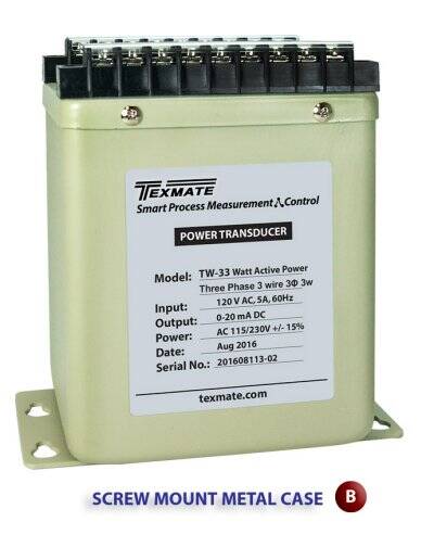 Two case styles provide mounting flexibility. The metal case versions with screw flanges easily attach to a plate or panel, Two plastic case sizes mount on a 35mm DIN rail. All Texmate transducers offer 2kV isolation and high immunity to external noise. Standard accuracy is ±0.2%, with ±0.1% also available. In addition to the standard input/output ranges shown below, custom ranges can be special ordered.